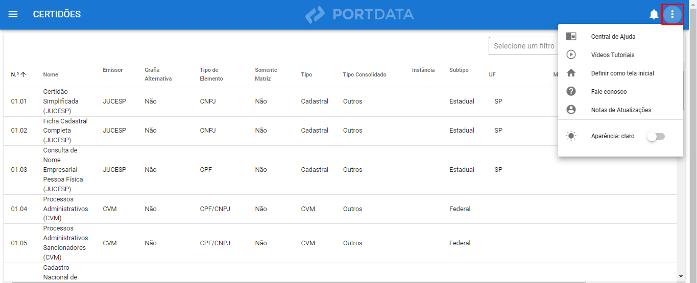 Na plataforma, vá no canto superior direito e clique nos três pontos laterais, lá você encontrará algumas funcionalidades adicionais da plataforma melhor detalhadas abaixo.