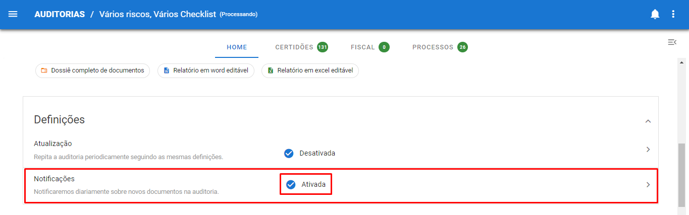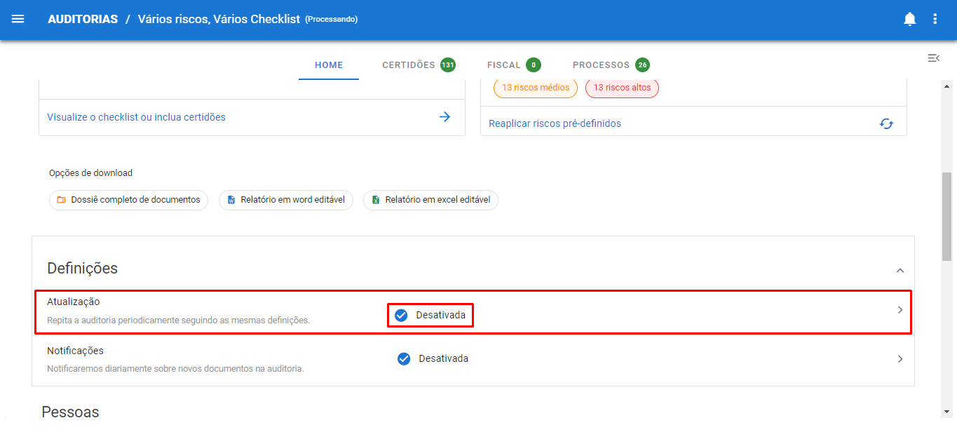 A atualização pode ser configurada para acontecer pontualmente ou periodicamente e ambas gerarão uma visão comparativa entre o status de cada certidão da auditoria original e aquelas da auditoria atual, indicando as alterações de apontamentos nas certidões.
