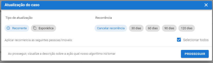 O campo “Atualização” permite que um caso criado anteriormente seja atualizado. Essa função é útil para os casos em que as certidões perdem sua validade.