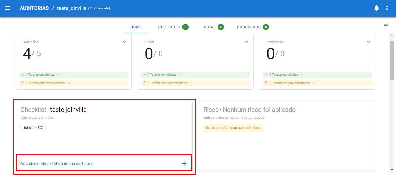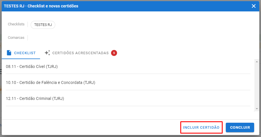 A sessão “Checklist” indica o(s) Checklist(s) usado(s) na auditoria e a(s) comarca(s), permite também que sejam inseridas novas certidões. Para isso siga os passos abaixo: