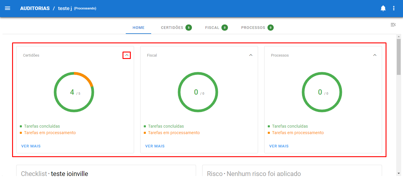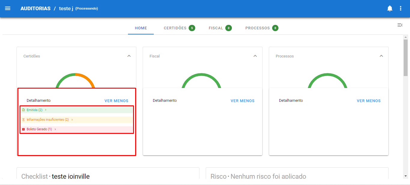 Em “Home” você pode acompanhar o processamento das certidões, apontamentos fiscais e processos. Além disso, acessar filtros dos “Status” das tarefas intuitivamente. É possível visualizar o andamento da sua auditoria de duas maneiras distintas: