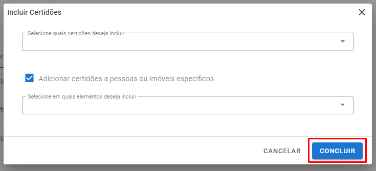 3. Selecione a(s) certidão(ões) desejada(s), você pode escolher adicionar para todos os elementos da auditoria ou para um ou mais elementos em particular selecionando o campo “Adicionar certidões a pessoas ou imóveis específicos” e escolhendo o(s) elemento(s). Após finalização, clique em “Concluir”: