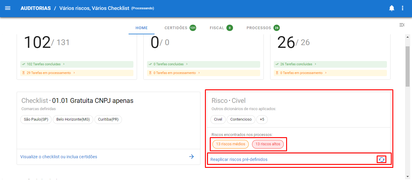 O que significa o campo “Risco”?O campo “Risco” traz a(s) lista(s) de risco(s) escolhida(s) e se a lista for alterada após o início de uma auditoria, é possível atualizá-la clicando no campo “Reaplicar riscos pré-definidos” destacado abaixo. Além disso, filtros já parametrizados ficam disponíveis para seleção: